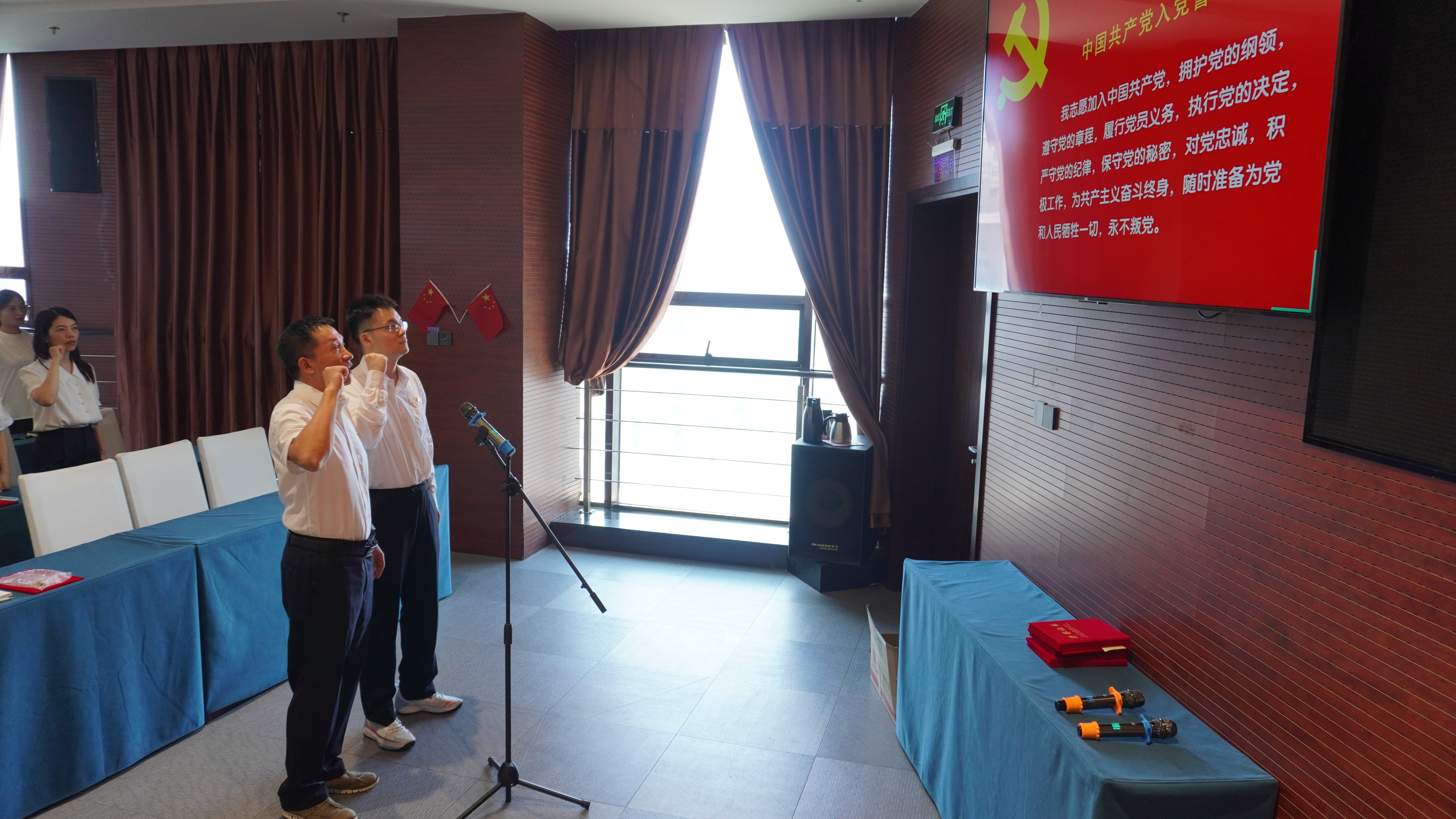 公司黨委委員、紀(jì)委書(shū)記、工會(huì)主席董峰帶領(lǐng)新黨員宣誓、老黨員重溫入黨誓詞。